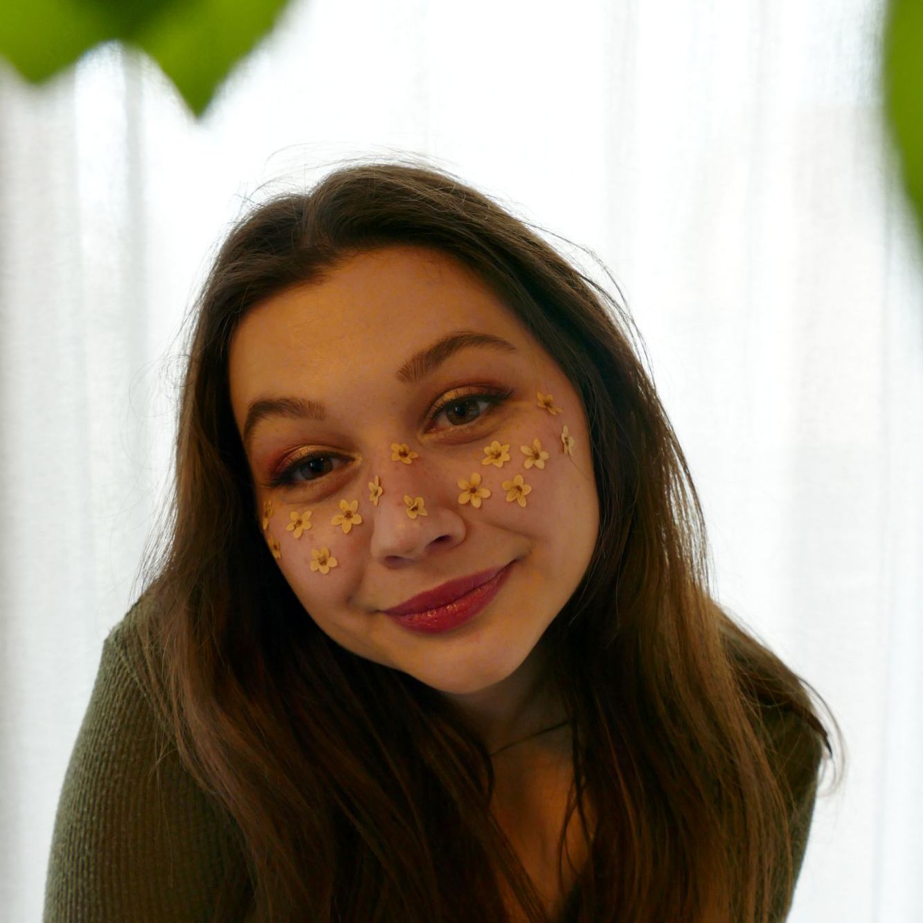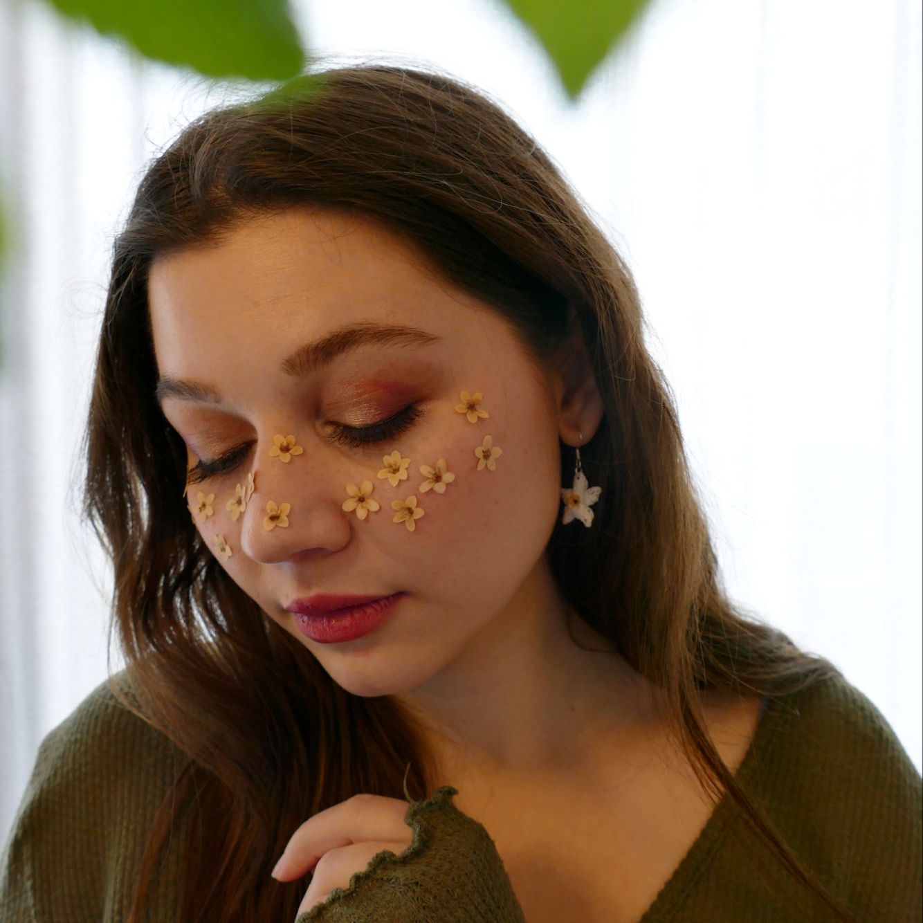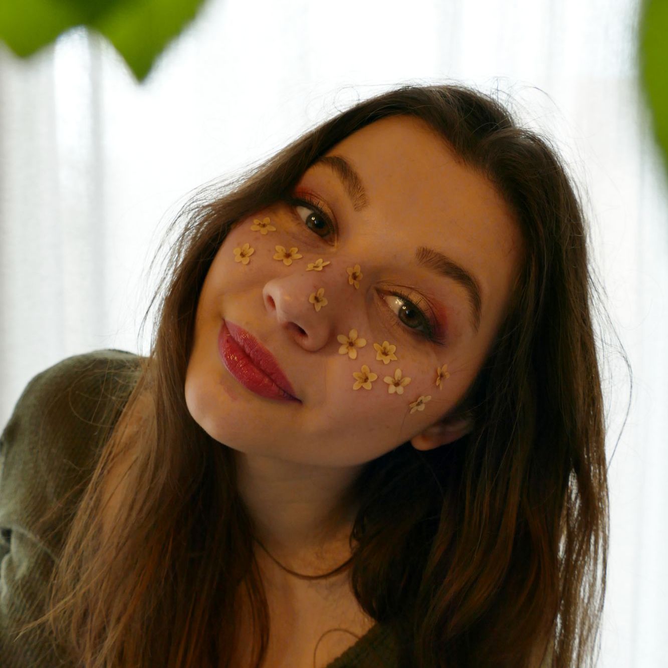 Der Frühling hat mich mit seinen ersten Blumen und frischen Farben zu diesem Look inspiriert. Als Sommersprossen habe ich echte Blumen verwendet die ich letztes Jahr gesammelt und getrocknet habe. Mit Wimperkleber ließen diese sich erstaunlich einfach ankleben und haben wirklich gut gehalten. Für das Augen-Makeup habe ich zu einem kräftigen Pink gegriffen, welches in einen Goldton übergeht. Es ist gar nicht so einfach ein Foto von mir zu machen, auf dem man meinen Lidschatten gut sehen kann. Irgendwie habe ich das Gefühl, bei mir wirkt das schnell unnatürlich. Es mag an meinen Schlupflidern liegen oder einfach daran, dass ich meistens auf Fotos lieber lache, als all zu ernst zu schauen.^^ Unsre kleine Milly kam ganz neugierig nachsehen was ich so treibe und hat sich sogar ganz brav mit ablichten lassen. Ihr eigentliches Interesse galt dabei aber wohl eher der Frage, wieso ihr Kratzbaum plötzlich als Lichtstativ herhalten muss.^^