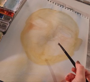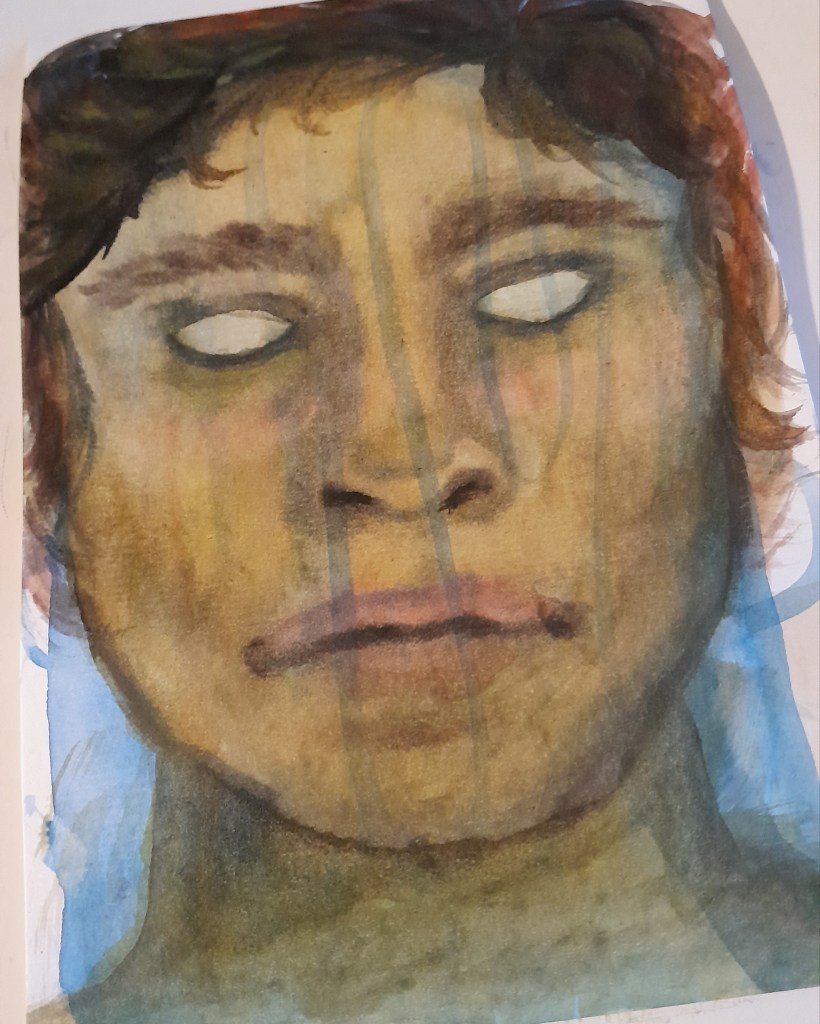 Ich habe zunächst einfach des Papier nach Gefühl mit Farben bepinselt, nach und nach habe ich dann das Gesicht herausgearbeitet. Dabei habe ich versucht möglichst viel von den natürlich entstandenen Verläufen beizubehalten. Immer wieder bin ich mit der Farbe Schicht für Schicht über mein Bild gegangen und habe Details hinzugefügt, Farben angepasst und Kontraste geschaffen. Dann habe ich mit verschiedenen Techniken wie Farbspritzern und Salzkristallen noch etwas mehr Spannung hinein gebracht. Zuletzt habe ich nach Bedarf auf die hellsten Stellen Akzente gesetzt.