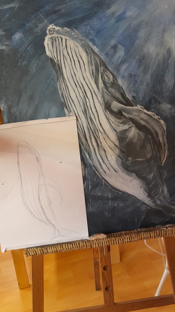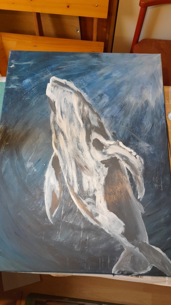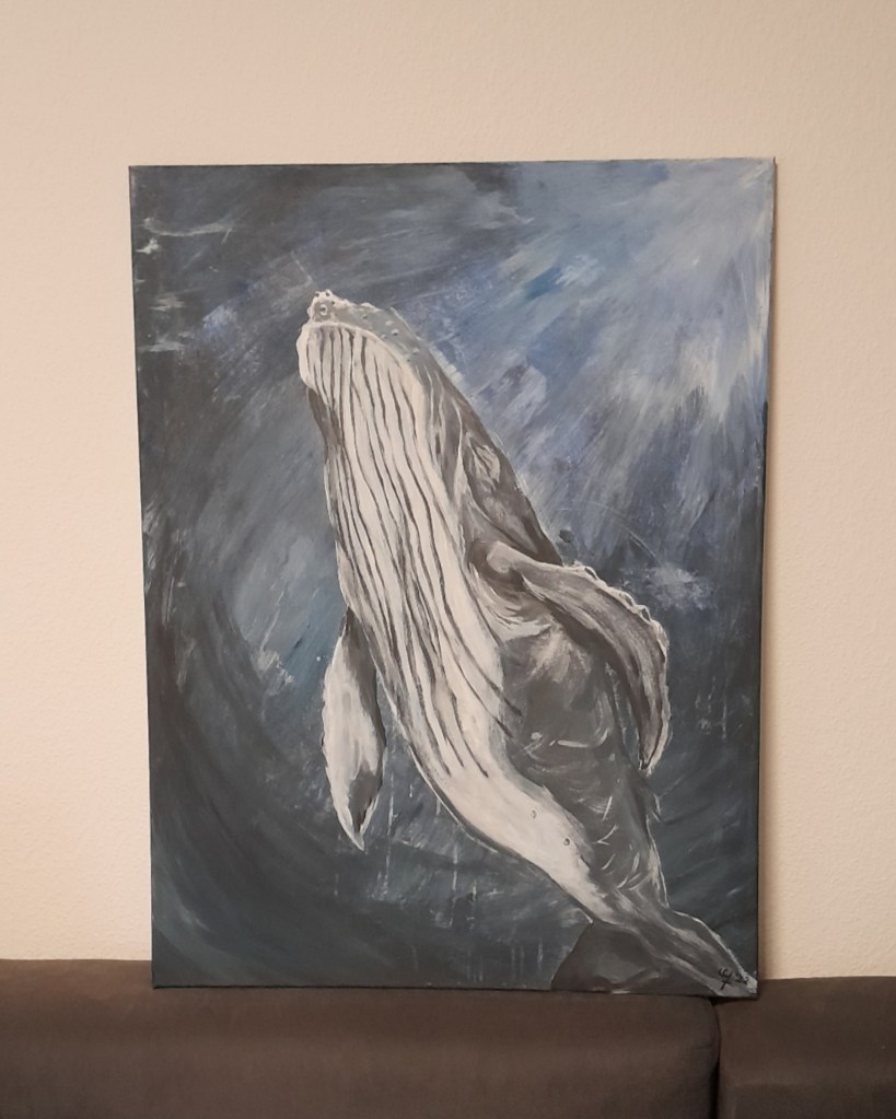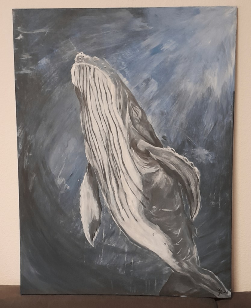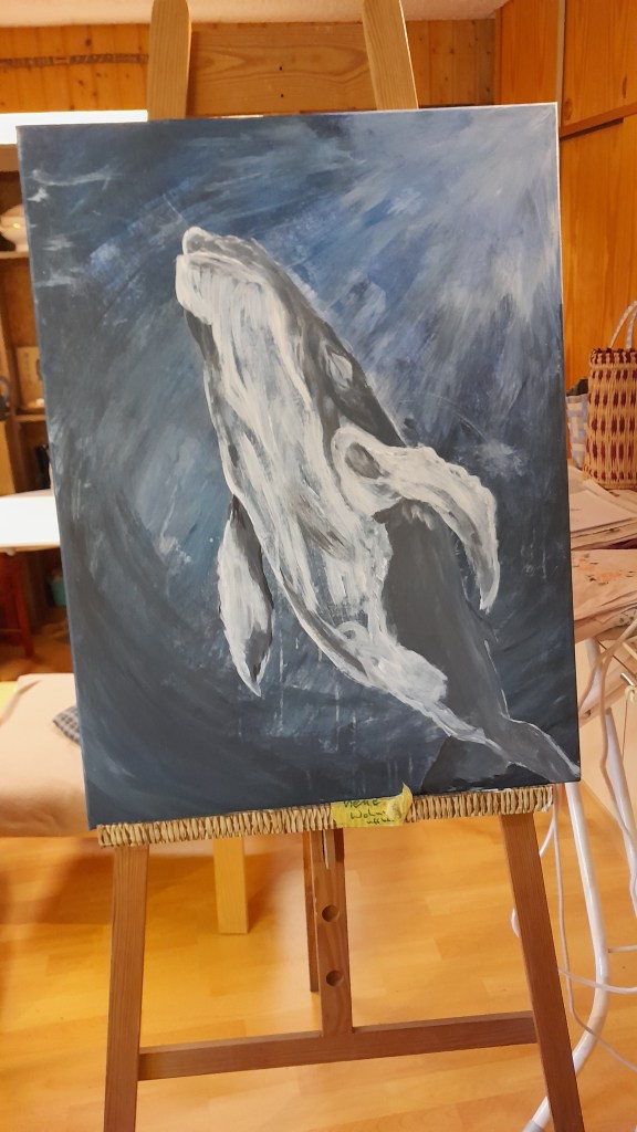 Ich wollte, dass das Bild eine beruhigende Wirkung hat und man das Gefühl bekommt, Ruhe in dem tiefen Blau zu finden. Der Wal sonnt sich in einem Lichtstrahl der durchs Wasser bricht.
