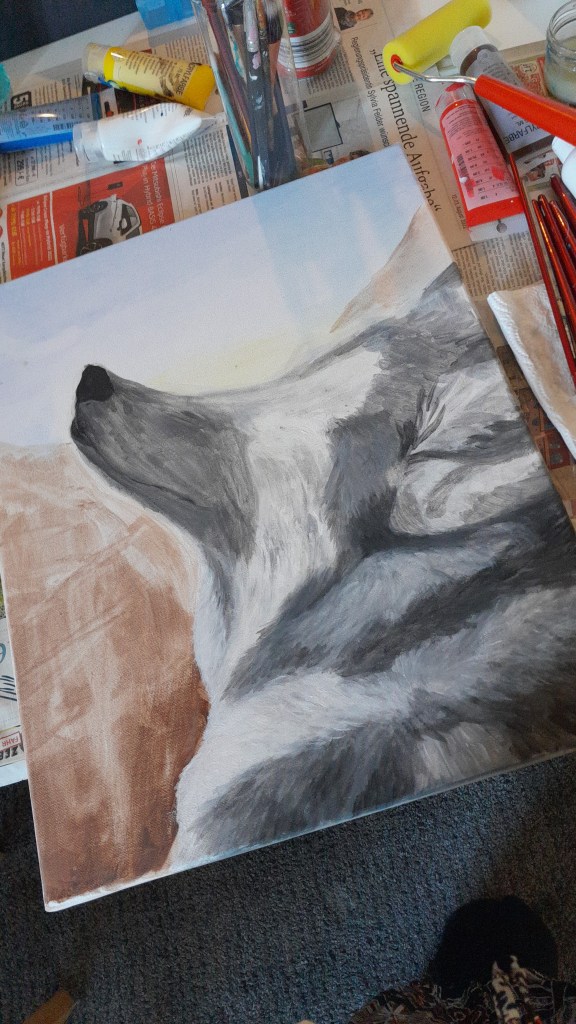 Das Bild habe ich mit Acryl auf Leinwand gemalt. Dabei habe ich zunächst die groben Proportionen und die Bildaufteilung angelegt. Nach und nach habe ich den Hund weiter ausgearbeitet. Nach dem der Husky Form angenommen hatte, und ich sicher war wo Hund aufhört und Hintergrund anfängt, habe ich die Berge, das Grün und den Himmel gemalt. Dann habe ich im letzten Schritt das Hundeportrait fertig gestellt.