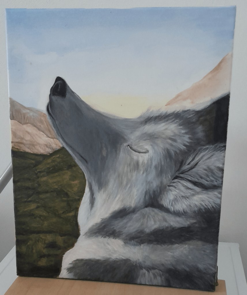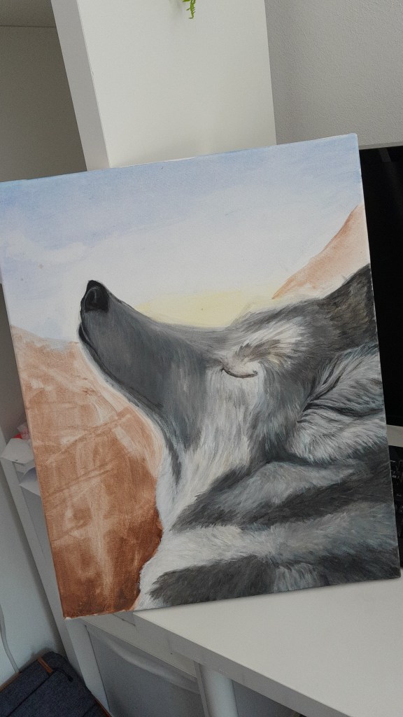 Dieses Bild hat mein Freund zu seinem letzten Geburtstag bekommen. Hunde sind seine Lieblingstiere (mit Ausnahme unseres Kätzchens natürlich,) deshalb habe ich mich für einen Husky entschieden. Ich wollte ein Tierportrait das von der Stimmung zu dem Wal passt, den ich vor einiger Zeit für mich selbst gemalt habe. Auch hier könnte man meinen, das Tier würde sich in einem Lichtstrahl sonnen, oder die erste Wärme genießen, die nach einer langen Nacht seine kalte Nase wärmt. Das Bild soll in unserem Schlafzimmer aufgehängt werden.