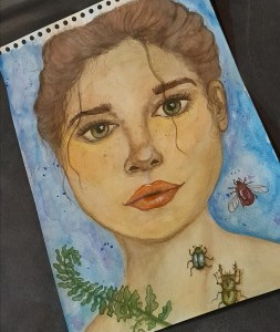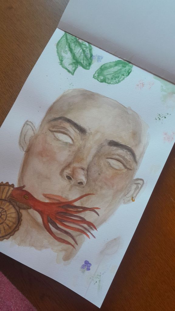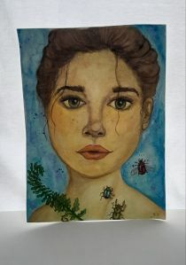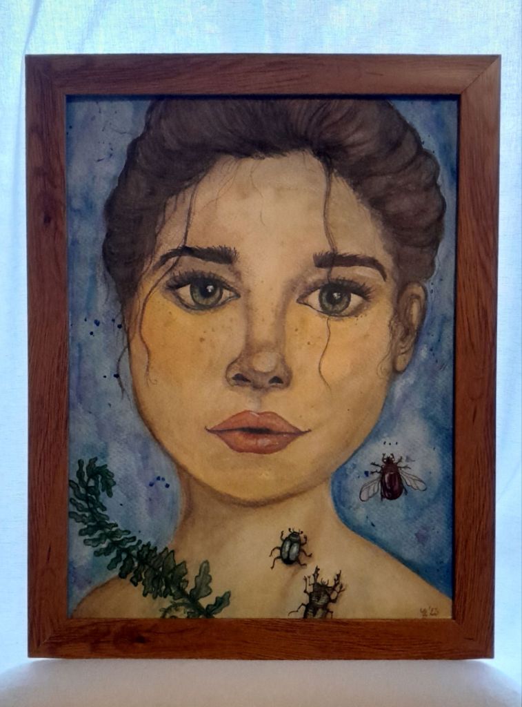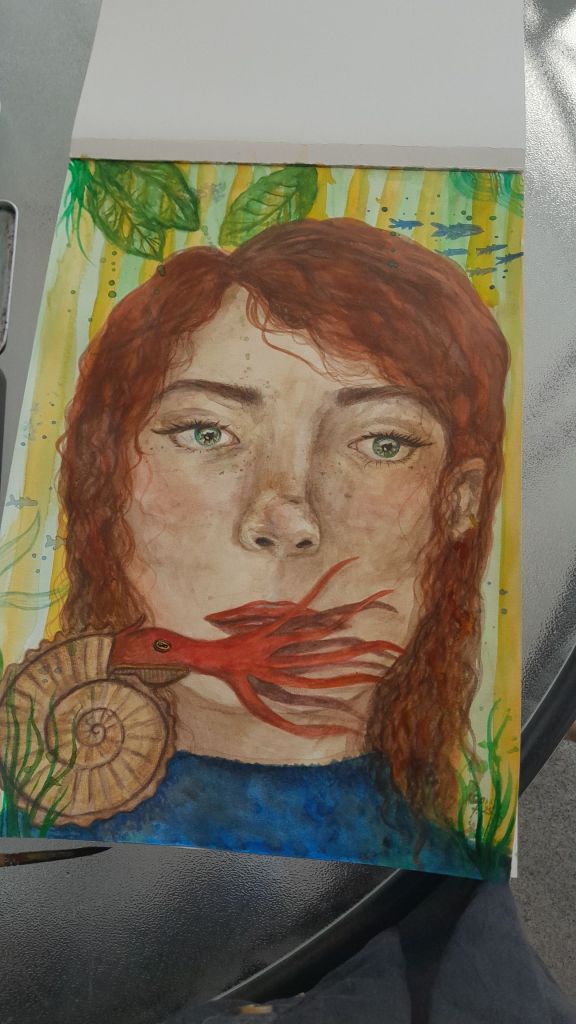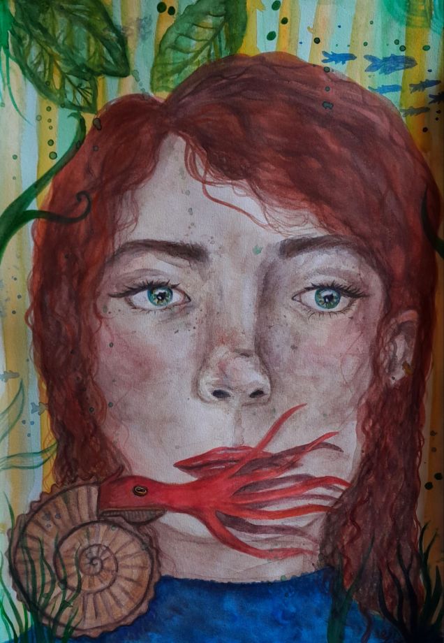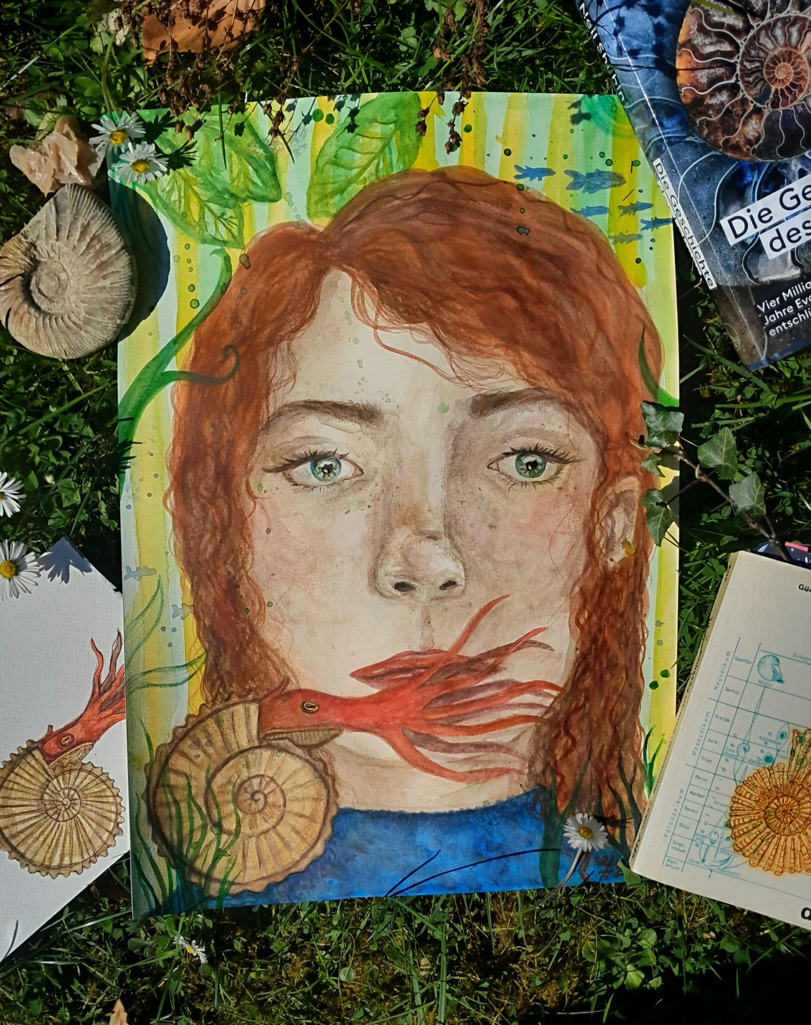 Bei meinen Aquarellportraits lasse ich mich am liebsten einfach vom Prozess leiten und experimentere gerne mit verschiedenen Techniken herum. Bei diesem Bild habe ich mit von meiner Faszination für die Natur inspirieren lassen. Meine Begeisterung fürs Steine und Muscheln sammeln und mein Interesse an Fossilien und Mineralien liegt in der Familie. Zusammen mit meiner Oma betrachte ich gerne all die unterschiedlichen Schätze, die sich in ihrem Haus über Generationen angesammelt haben.