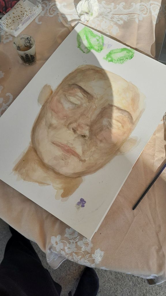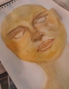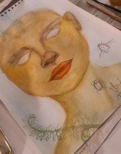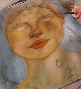 Ich habe erst mit Aquarellfarbe das Gesicht aus dem Hintergrund herausgearbeitet und anschließend mit meinen Prismacolor und meinen Polychromos weitere Details hinzugefügt.