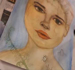 Es hat richtig Spaß gemacht mal wieder meinen Aquarellkasten auszupacken. Dabei ist dieses Portrait entstanden. Am liebsten male ich solche Bilder möglichst am Stück, dass heißt ich male einen oder mehrere Tage mit kleinen Pausen bis es fertig ist. Wenn zu viele Tage zwischen drin vergehen, besteht immer die Gefahr, dass ich mich nicht mehr ran traue. Dafür habe ich aber nicht immer die Zeit, vor allem da ich ja auch noch so viele andere Dinge gerne mache… Grade deshalb war es richtig gut mal wieder die Möglichkeit zu nutzen, mich so richtig der Farbe hinzugeben.