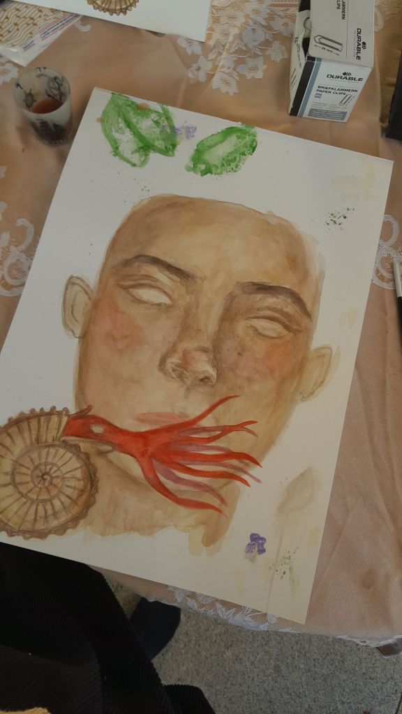 Auch dieses Ma habe ich den Prozess festgehalten. Nach dem das Gesicht geleget war, habe ich im Garten Blätter gesmmelt und die Umrisse mit Hilfe eines Hammers aufs Papier „gedruckt“. Diese habe ich anschlißend mit Farbe nach gezeichnet und ins Bild integriert.