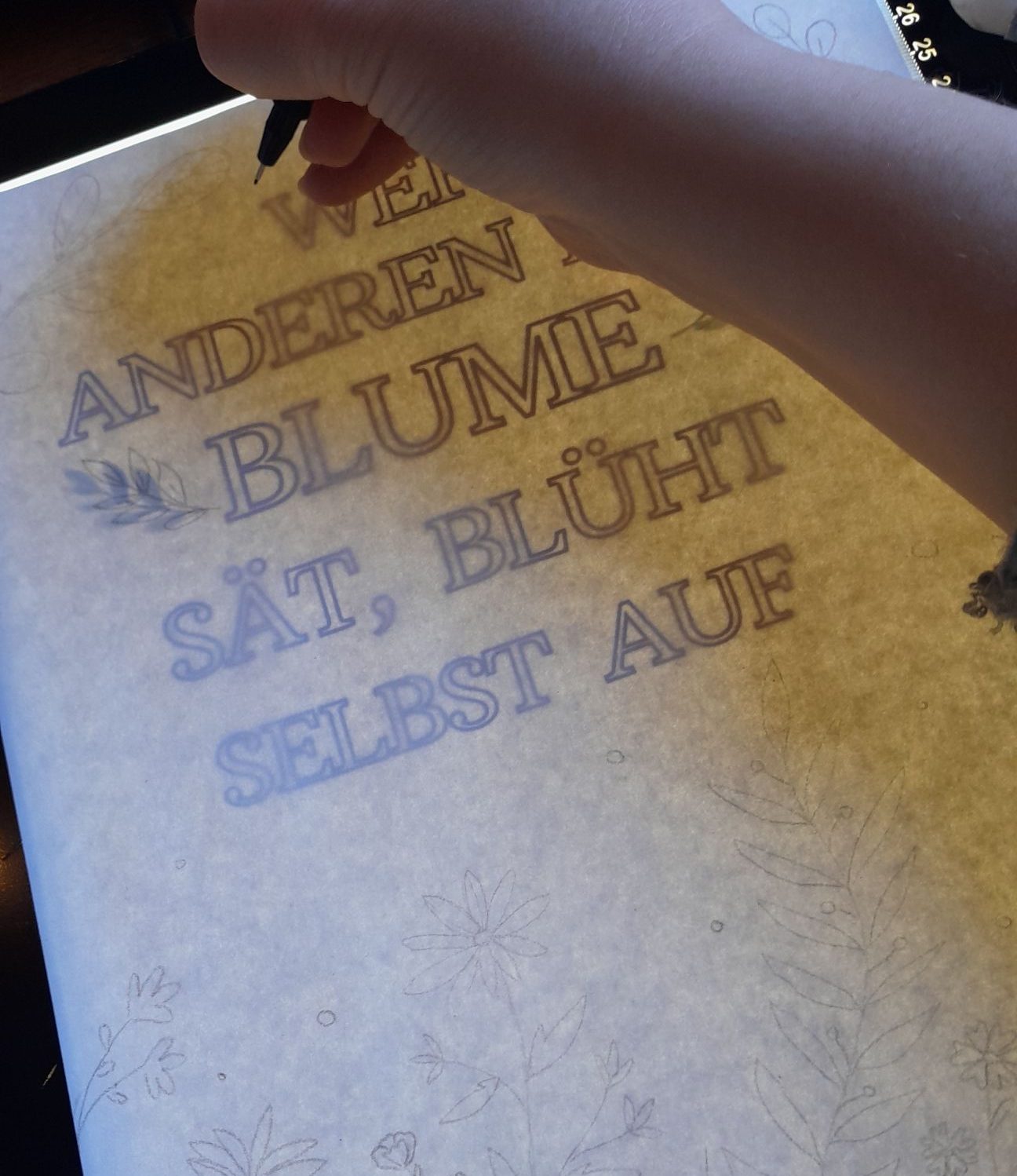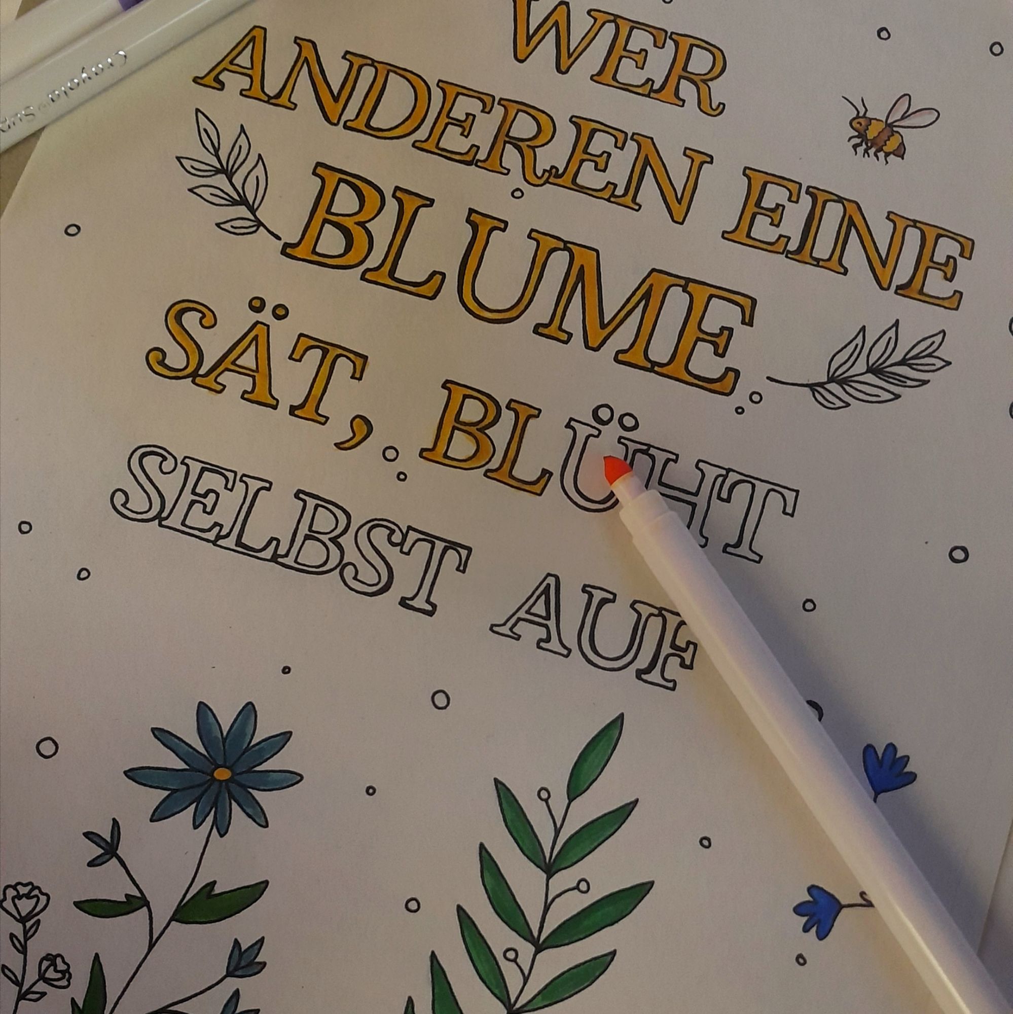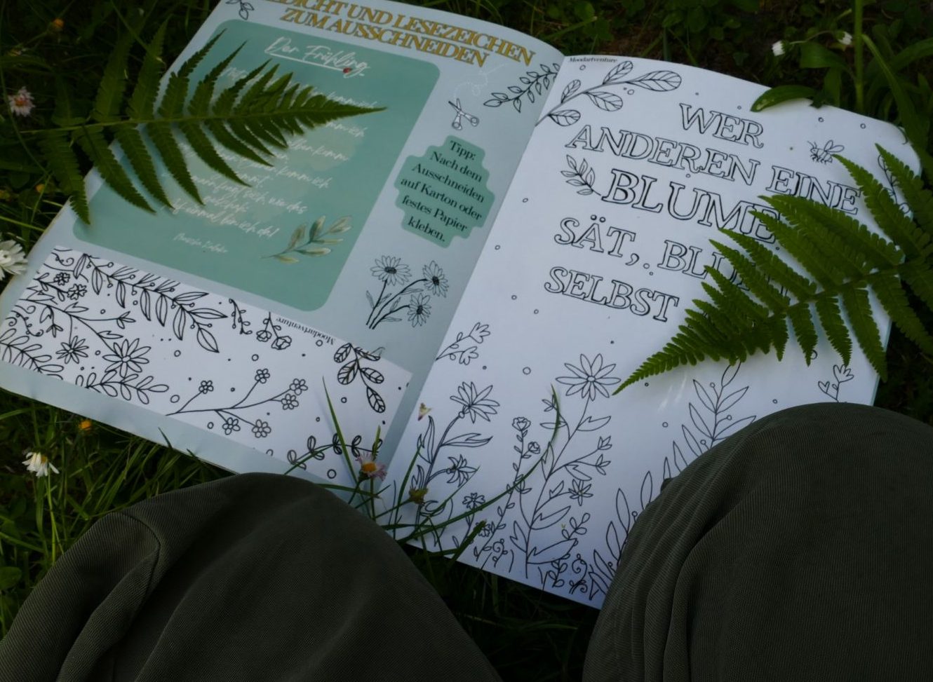 Für meine ganz eigene Zeitung durften süße Ausmalbilder auf keinen Fall fehlen! Ich habe mich dabei für einen illustrierten Spruch und ein Lesezeichen entschieden. Ich habe den Spruch zunächst am PC geschrieben und die Lettern solange umhergeschoben, bis mir die Aufteilung gefiel. Anschließend habe ich den Spruch auf mein Leuchttablet gelegt und ein weiteres Blatt darüber plaziert. Auf diesem habe ich dann die Blumen und Verziehungen freihand skizziert und am Schluss alles mit einem schwarzen Fine Liner nachgefahren. Nach dem ich es eingescannt hatte konnte ich es in mein Magazin einbetten.