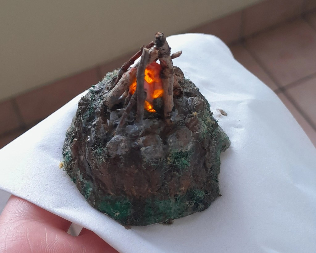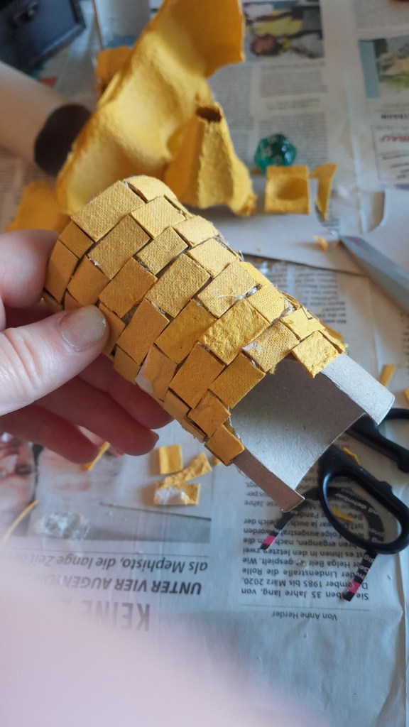Am unteren Rand habe ich den Stoff mit brauer und grauer Farbe so aussehen lassen, als wäre er ein wenig „dreckig“. Durch die schwarze Unterseite, die an den Seiten ein wenig hervor lugt, wirkt es beinahe ein bisschen so, als würden die Gespenster beim Schweben einen Schatten unter seich werfen.