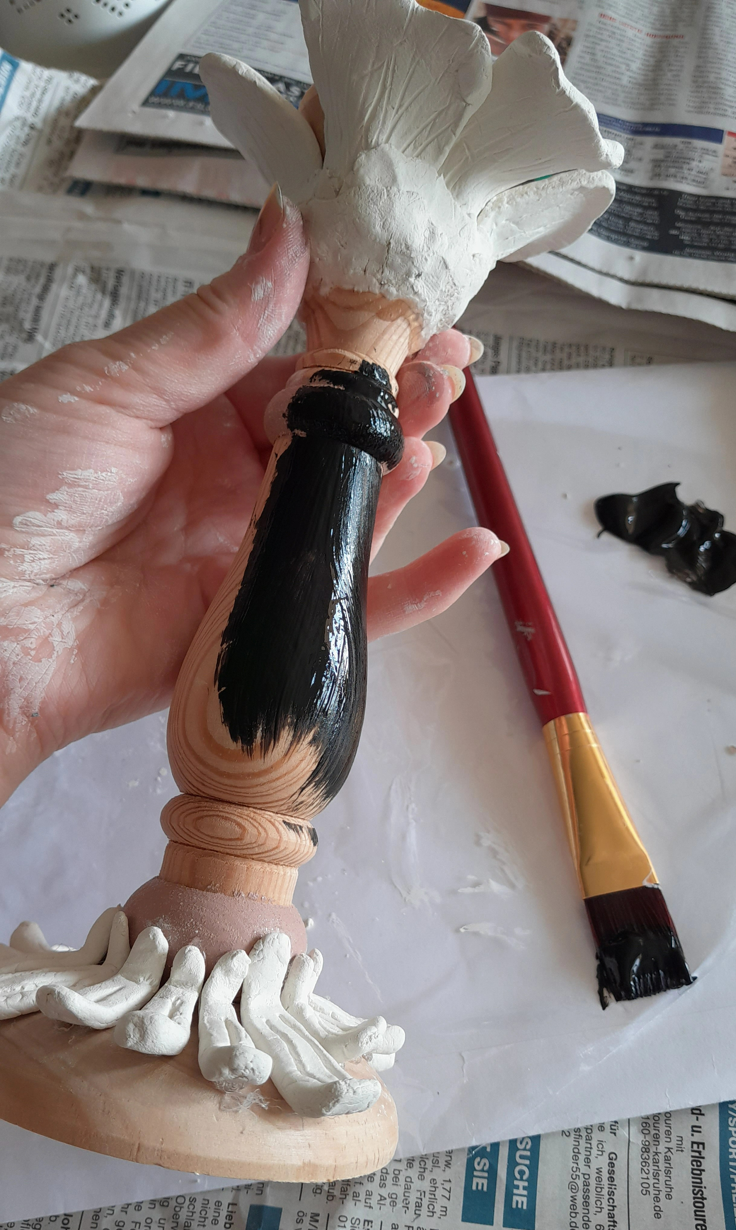 Zuerst habe ich die Masse etwas weich geknetet, dadurch lässt sie sich einfacher verarbeiten. Dann wurden die Geister sowie einen kleiner Kürbis geformt. Die Arme, sowie den Schwanz der Katze, Strunk und Blatt vom Kürbis, habe ich angefügt. Dafür müssen die Teile gut mit einander verbunden werden. Ich nutze etwas Wasser und streiche die Übergange solange glatt bis sie ganz in die Ursprungsform übergehen. Mit etwas Wasser lässt sich auch die Oberflächen besser glattstreichen. Ich habe meine kleinen Geister auf einem Stük Backpapier durch trocknen lassen. Am besten wendet man die Teile dabei ab und an, sodass sie auch von unten trocknen können.