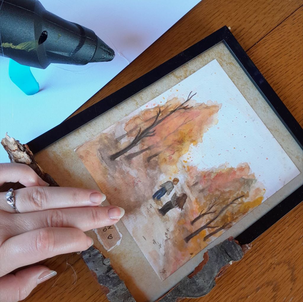 Diese habe ich mit einer Gartenschere zurecht geschnitten. Anschließend habe ich die Teile auf einem alten Bilderrahmen hin und her geschoben, bis mir das Ergebnis gefallen hat. Mit Heißkleber habe ich alle Holzstücke festgeklebt. Mir gefällt der Holzrahmen super gut. Und es ist eine prima Möglichkeit einen alten Rahmen zu recyceln, der einem nicht mehr so gut gefällt oder, wie in meinem Fall, eine Macke hat.