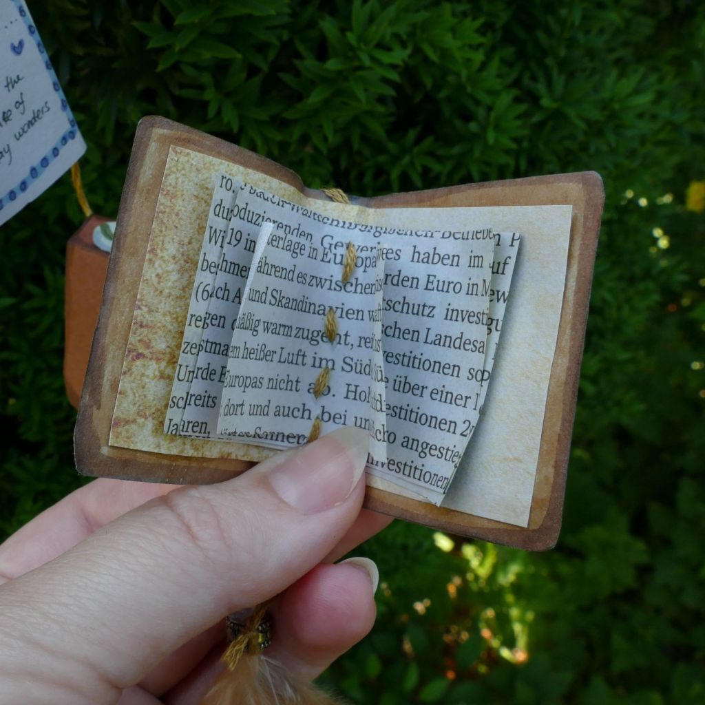 Dafür habe ich aus dem Papier Rechtecke ausgeschnitten. Für die „Buch-Seiten“ habe ich Zeitungspapier verwendet. Dafür habe ich je drei Vierecke ausgeschnitten, die etwas kleiner sind als das braune Papier. Besonders hübsch wirkt es, wenn die oberste Zeitungslage etwas kleiner als die darunter ist, dann sieht man die verschiedenen Schichten besser.