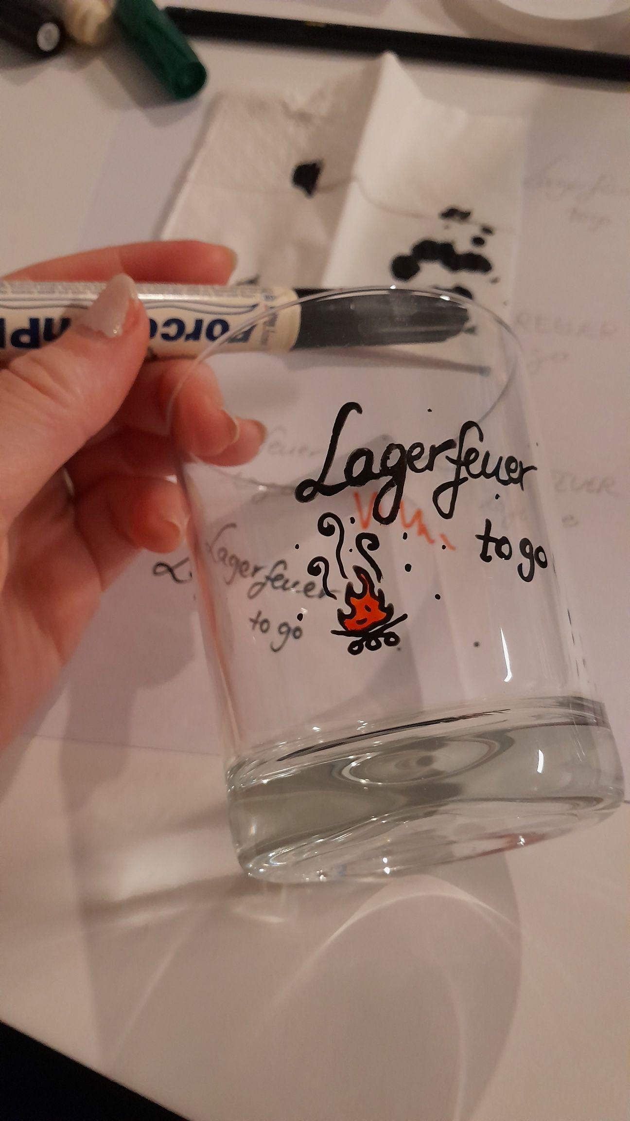 Mit meinen Glasmalstiften habe ich die Gläser bemalt. Anschließend habe ich sie im Ofen bei 160° für 90 min eingebrannt. Dannach sind sie lebensmittelecht und sogar Spühlmaschienen geeignet. Wichtig ist allerdeings die Gläser in den kalten Backofen zu stellen, damit sie sich langsam erhitzen und auch nach den 90 min im Backofen auskühlen zu lassen.
