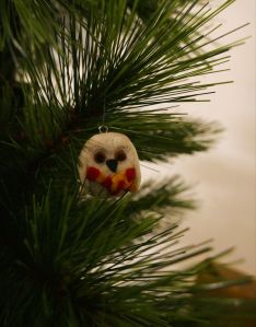 Zunächst habe ich die Styroporform umfilzt. Die beiden kleineren Kugeln, die als Augen dienen habe ich ohne Styropor-Form gefilz. Dafür habe ich aus der Wolle kleine Päckchen geformt, die beim Bearbeiten mit der Nadeln immer wieder gedreht und gewendet werden. Mit weißer, schwarzer und roter Wolle habe ich dann die Details hinzugefügt.