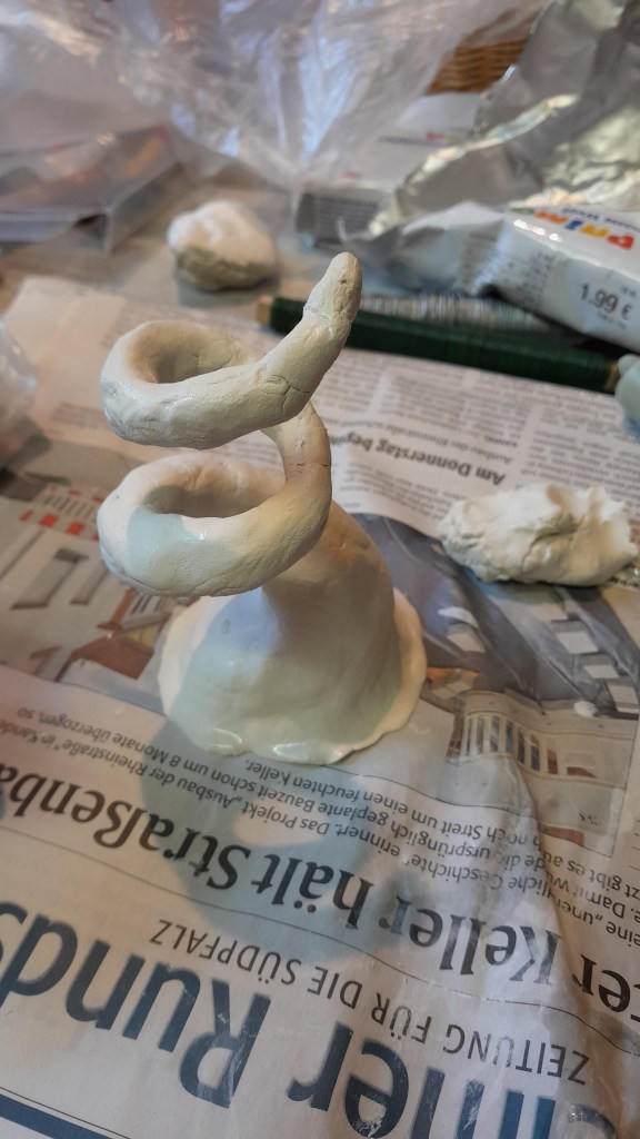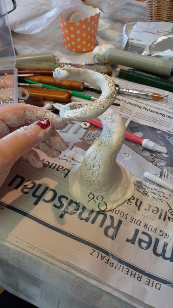 Ganz wichtig ist, vor dem Aushärten nicht zu vergessen die ensprechenden Löcher zu machen, an denen die Schmuckhänger später an den Steckern befestigt werden. Dafür habe ich eine Nadel verwendet.